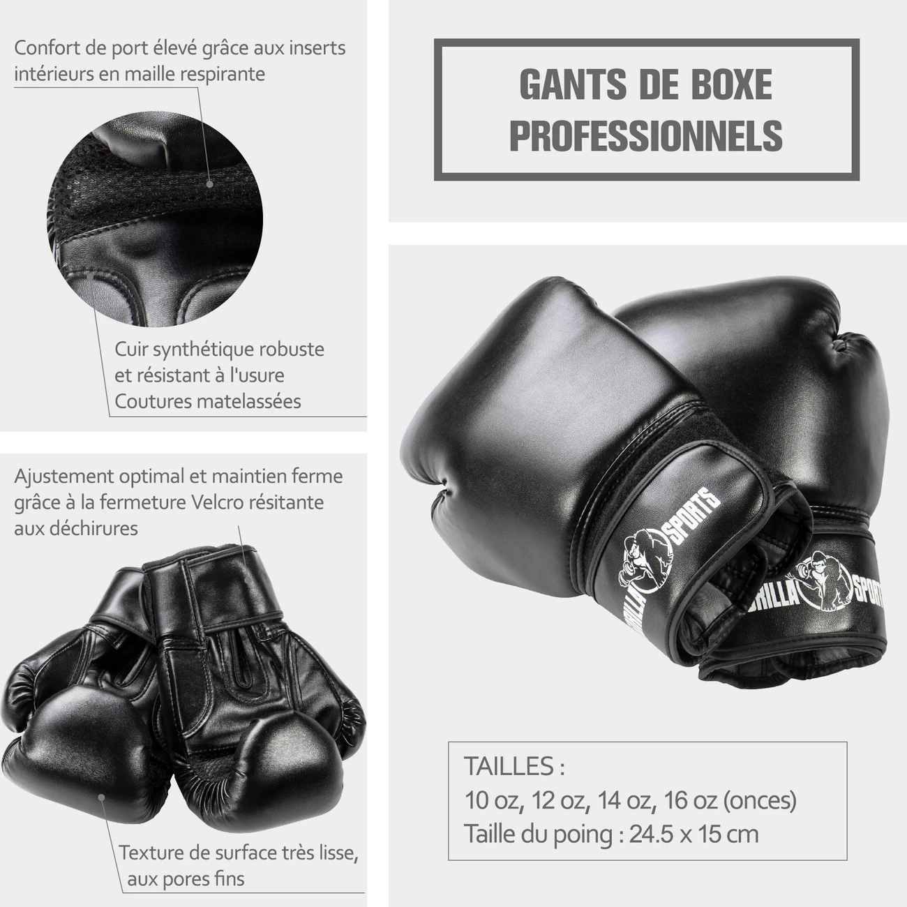 Entrainez-vous en toute tranquillité et à pleine puissance à avec nos gants professionnels gorilla sports.pour préserver vos poignets et vos poings une paire de gants offrant un rembourrage de haute qualité est indispensable. Grace aux aérations présentes au niveau de la paume et des doigts, la transpiration inévitable sera facilement évacuée.mis au point pour la pratique de la boxe ces gants sont disponibles en 4 versions avec des poids différents. La taille des gants se décline en une unité de mesure appelée oz, plus ce poids sera important et plus le rembourrage est épais et donc offre une protection plus importante.spécifications des gants de boxe professionnels gorilla sports coloris noir :dimensions : largeur 24,5 cm et longueur 15 cmdisponible dans les versions suivantes et (votre poids) :10 oz (65-78kg), 12 oz (78-90kg), 14 oz (> 90kg) et 16 oz (> 90kg pour plus de protection)couture résistante pour une longévité accruefermeture par velcro avec logo gorilla sportsle choix des gants se fera selon l’utilisation souhaitée, par exemple pour la compétition le choix des poids de 10 à 12 oz sera fait, pour l’entrainement ce seront les poids de 10 à 18 oz et pour le sparring (échanges avec un partenaire) optez pour un poids de 16 oz à 18 oz.