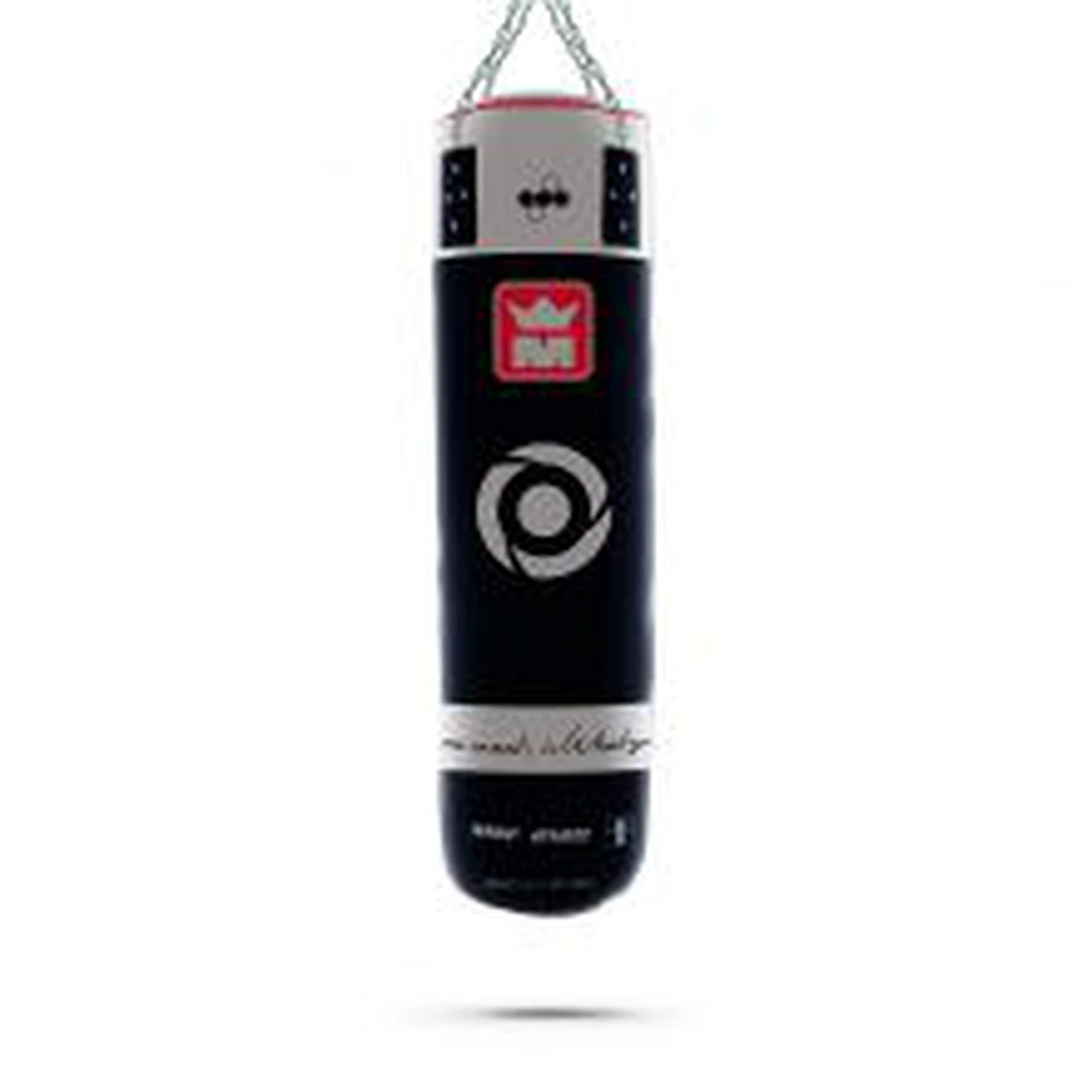 Sac de frappe plein en “PolyComposite Barex” ultra résistant. Accrochage 4 chaînes avec rotule. Rempli avec des chutes de textiles.